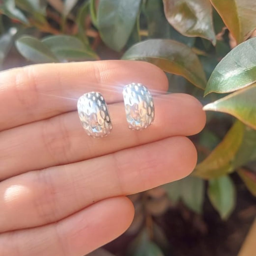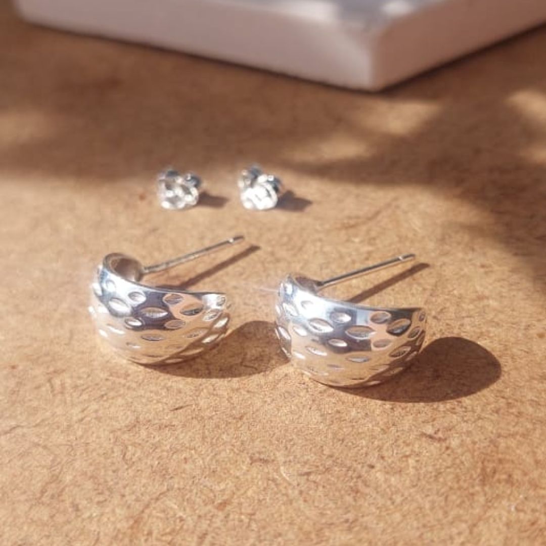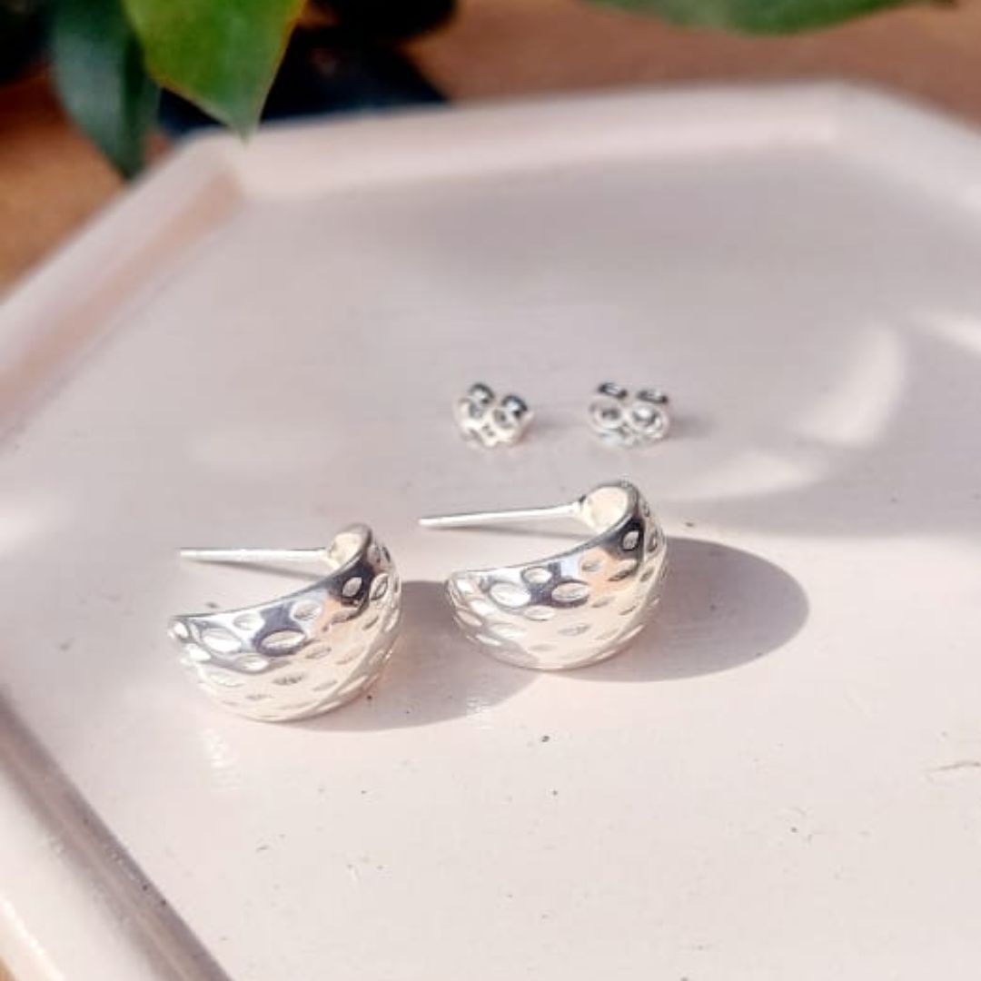 Aretes en plata 925 con diseño tipo media argolla ancha y textura martillada que aporta brillo y un estilo único. Su acabado artesanal los convierte en una pieza elegante y moderna, perfecta para realzar cualquier look con un toque distintivo y sofisticado.