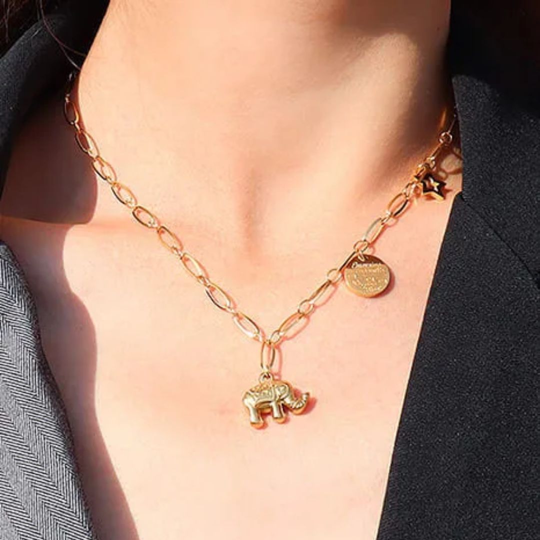 Cadena de eslabones con trio de dijes, elefante, estrella y medalla