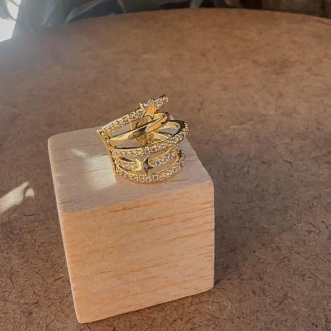 Earcuff en rodio dorado, diseño de múltiples aros decorados con circonias brillantes y pequeños detalles de estrellas. Una pieza moderna y llamativa que no requiere perforación, perfecta para aportar un toque cósmico y sofisticado a tu estilo